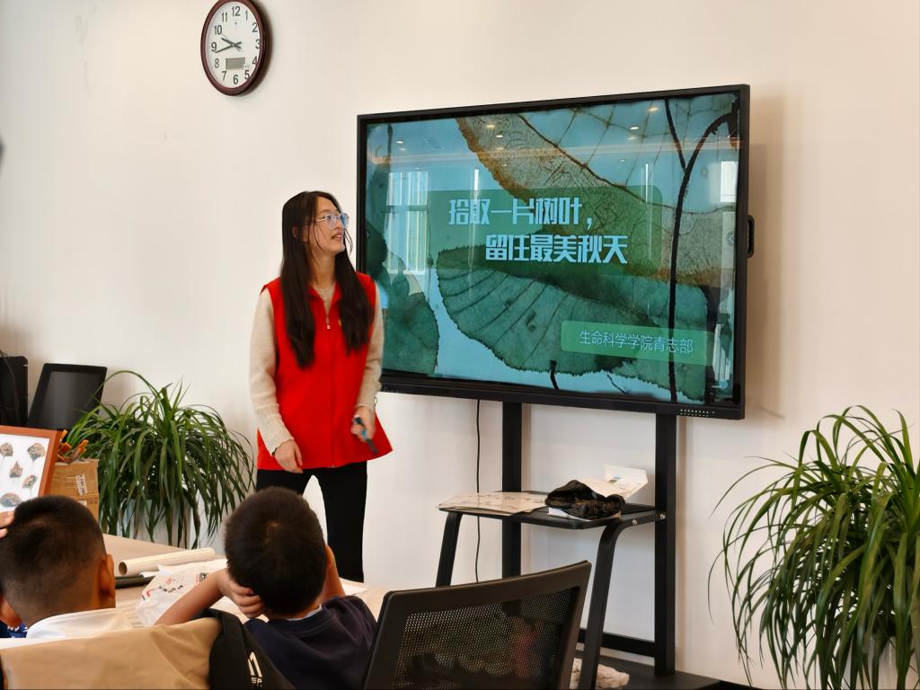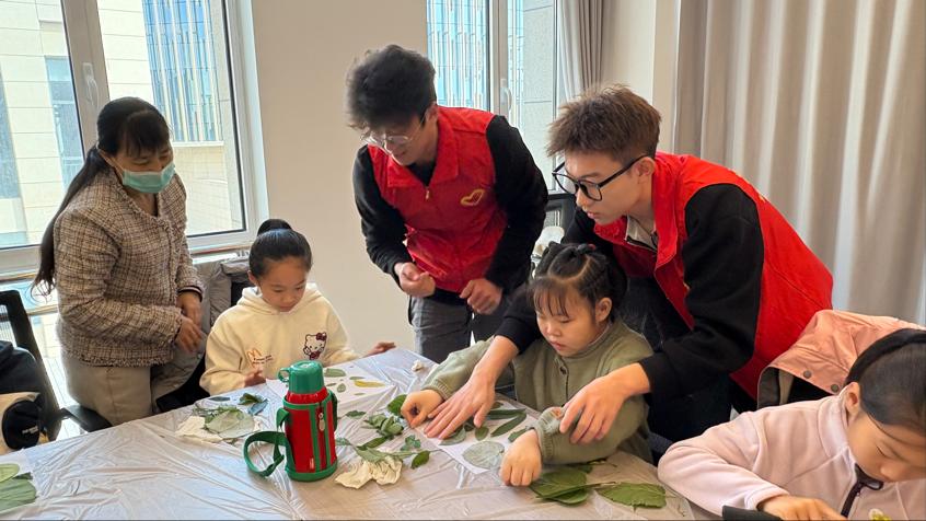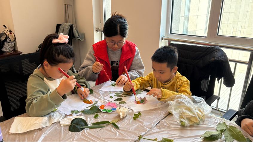 活动中,党员志愿者率先垂范,用通俗语言为小朋友讲解植物拓印的历史渊源与文化意义,随后手把手指导创作:从挑选纹理清晰的秋叶,到演示拓印工具用法、搭配色彩,全程耐心指导、细致协助,与孩子们共同完成一幅幅独具特色的树叶拓印作品。现场氛围热烈,孩子们专注创作、兴致盎然,在实践中感受自然之美与手工乐趣。活动尾声,志愿者有序清理场地并合影,展现良好风貌。