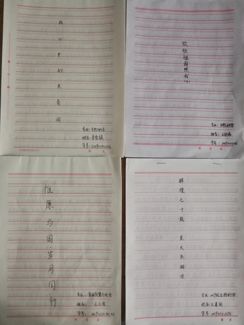 此次活动举办成果显著,同学们积极踊跃的参加了本次活动,参赛作品紧扣主题,字里行间无不流露着当代大学生对祖国深沉的爱与责任,一片赤子之心跃然纸上。经学院认真审查,最终评选出一等奖五人,二等奖七人,三等奖十人,评选的优秀作品均在宣传栏内展出,众多学子透过文字的力量感受到了家国情怀之深沉,凝聚了为中华民族伟大复兴贡献一己之力的激情。同学们纷纷表示,在此次活动中收获颇丰。