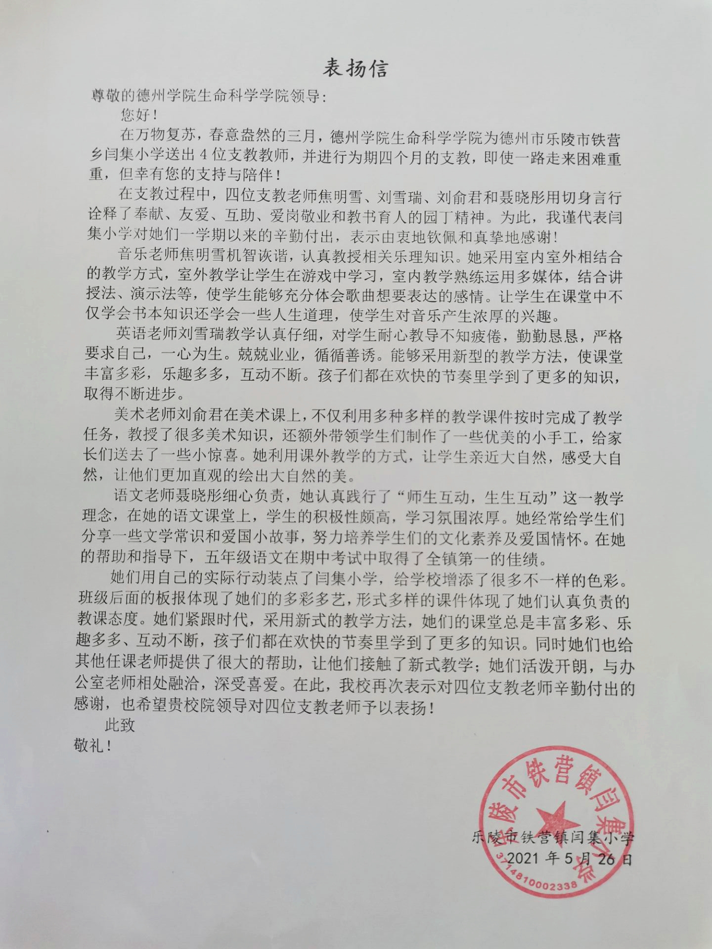2021年6月3日,kaiyun开云官方2018级生物科学本科班焦明雪、刘雪瑞、刘俞君和聂晓彤四位同学因在支教期间表现突出,受到了支教学校乐陵市铁营镇闫集小学的表扬。