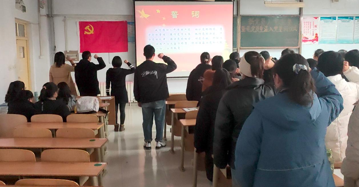 伴随着庄严的《国际歌》,在学生党员魏家宝同志的带领下,全体党员面对党旗高举右手,庄严宣誓:我志愿加入中国共产党,拥护党的纲领……随时准备为党和人民牺牲一切,永不叛党。全体党员用发自内心的声音抒发了自己对党忠诚的决心。仪式最后,党委书记赵庆福同志表示,在建党一百周年这个历史交汇期光荣入党,是非常幸运的,希望党员同志们不辜负党组织的期望,自觉增强党性修养,以实际行动践行入党誓言,践行党的宗旨,发扬党的优良传统,充分发挥党员的先锋模范作用,无愧于共产党员的光荣称号!