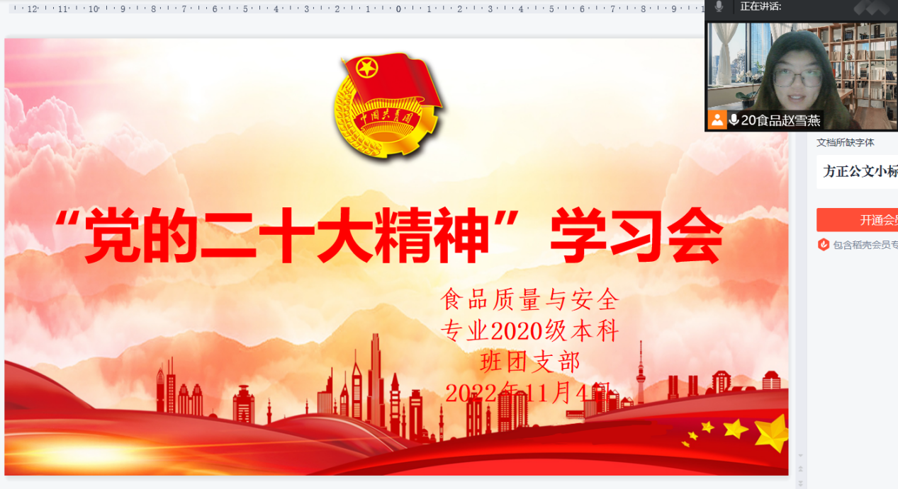 为贯彻落实习近平总书记在中国共产党第二十次全国代表大会上的重要讲话精神,kaiyun开云官方食品质量与安全专业2020级本科班团支部于2022年11月4日开展党的二十大精神学习会。