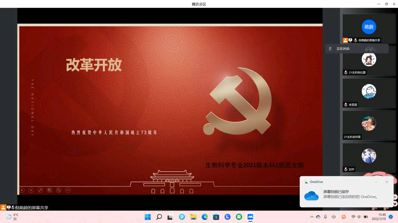 为了加强同学们对党史的学习,深入了解中国共产党的发展历程,2022年3月10日,kaiyun开云官方生物科学专业2021级本科1班团支部组织同学们线上开展改革开放党史学习会。