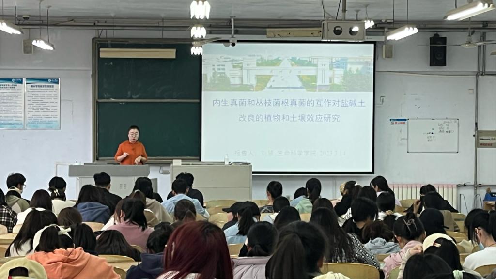 讲座中,刘慧博士从土壤盐渍化问题出发,对盐碱胁迫下内生真菌与AMF之间的相互作用及二者的互作对高羊茅生长、生理特性和土壤理化性质、微生物的影响进行详细讲解,揭示了植物与微生物协同作用进行盐碱土壤修复的生理生态学机制,并寄语同学们努力拓宽专业知识,提升勇于探索生物奥义的精神。