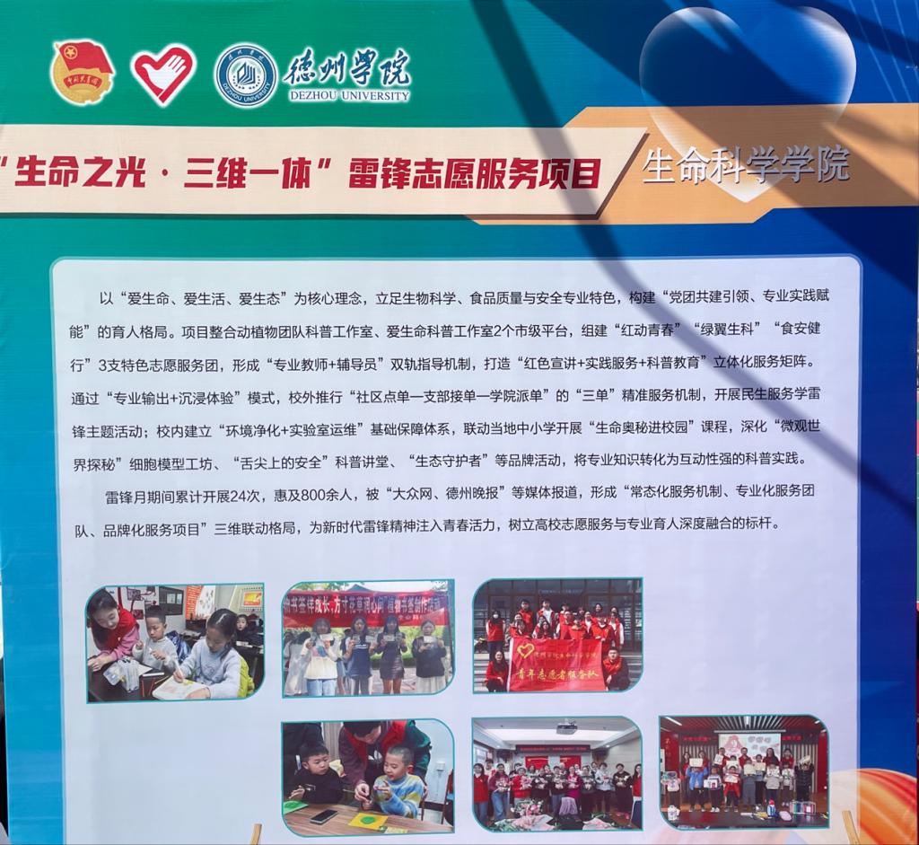 “生命之光·三维一体”项目围绕“爱生命、爱生活、爱生态”核心理念,充分发挥生物科学和食品质量与安全专业优势,打造“党团+专业”的育人模式。项目整合2大市级平台,成立3支特色志愿服务团,实施“专业教师 + 辅导员”双轨指导。在校内校外,搭建起集宣讲、服务、科普于一体的立体服务网络,不仅向社区提供精准服务,还走进中小学开展科普课程,打造多个品牌活动。雷锋月期间,项目开展24次,惠及800余人,获得“大众网、德州晚报”等媒体关注,构建起常态化、专业化、品牌化的志愿服务体系,成为高校将志愿服务与专业育人融合的典型范例。