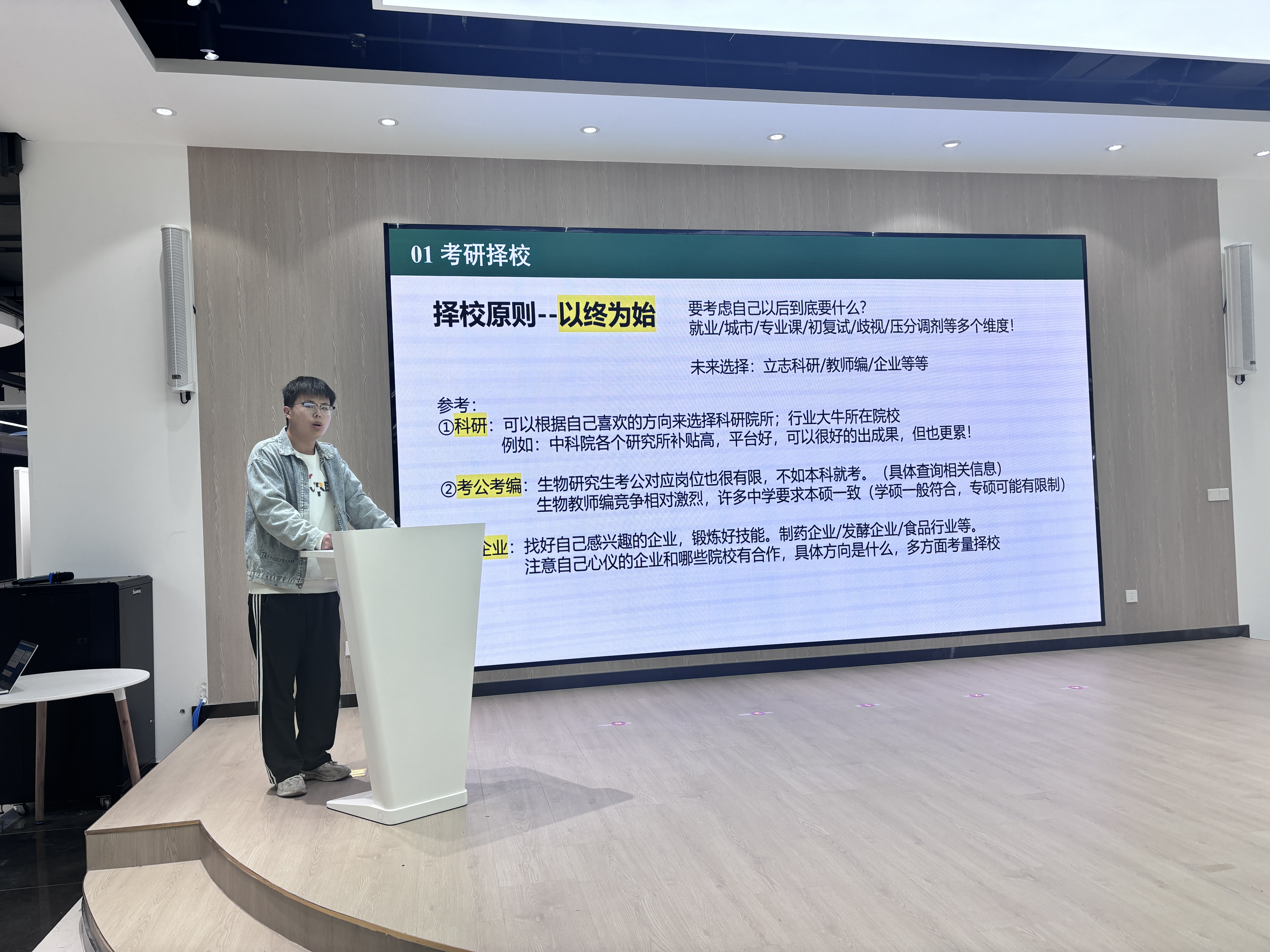 这场分享会如同一场及时雨,为正在或即将踏上考研征程的同学们答疑解惑、加油鼓劲。相信在前辈们的经验助力下,生科学子们定能在考研路上坚定前行,实现梦想,奔赴属于自己的灿烂未来。