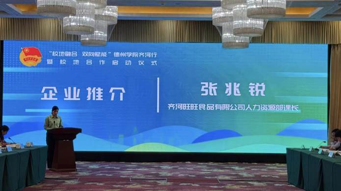 随后,齐河县工信局、永嘉社区、齐河旺旺食品有限公司依次进行推介。齐河县工信局负责人从产业布局、重点企业、发展优势到未来规划等多个角度,全面介绍了齐河县产业发展情况,系统展现了齐河县产业发展的蓬勃态势与巨大潜力;永嘉社区居委会主任分享了社区发展情况,包括社区基础设施建设、文化服务特色、居民需求及未来发展方向,为校地合作精准对接社区服务需求提供指引;齐河旺旺食品有限公司负责人对企业进行推介,介绍了企业的生产规模、产品特色、技术创新成果以及人才需求,并期望能深化与高等院校的定向合作,共建人才联合培养基地。