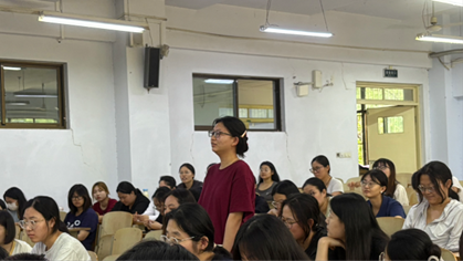 本次活动,武静茹校友结合自身丰富的教学及参赛经历,深度讲解教师专业成长。在教师比赛方面,她强调要严格把控时长,合理分配各环节时间,注意环节转换时用过渡语自然衔接。台下学生们凝神聆听,认真记录要点技巧。课堂教学中,她提倡用鼓励性语言激发学生积极性,结合生物学知识设计趣味案例,耐心应对课堂情况。谈及师生相处,她指出需以包容态度接纳差异,建立平等互信的师生关系。活动现场学生反响热烈,互动环节中,学生积极分享心得体会与困惑,武静茹校友也对其进行了细致解答。