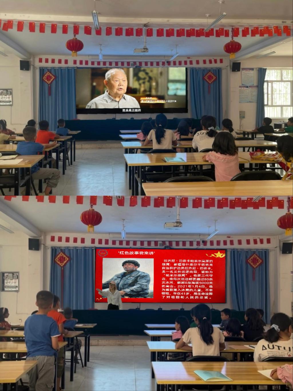 在共青团疏勒县委的支持下,志愿团走进疏勒县昆仑社区红领巾小课堂,以“铸魂”为核心,以红色故事为载体,系统开展爱国主义与红色精神培育。志愿者们不仅用深情语言讲述红色故事,还创新融入视频观看环节,增强爱国戍边精神传承的感染力。从“兵出渤海湾”的壮阔征程,到屯垦戍边的兵团岁月,再到护边员拉奇尼•巴依卡用生命守护国土的壮举,带领孩子们在历史与现实的交织中,深刻感悟新疆生产建设兵团的奋斗史和边疆发展的辉煌成就。