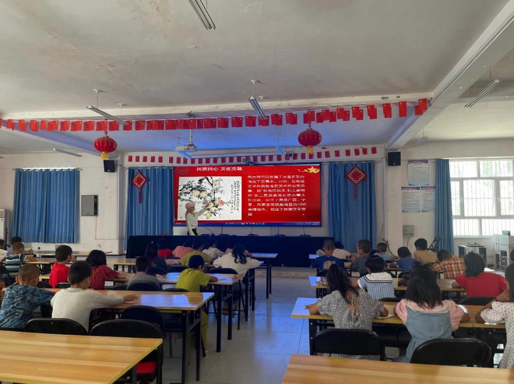 在“行走的民俗课堂”上,志愿者面向孩子们开展民族团结主题宣讲活动。第三届民族地区优秀美术作品展是“融情”行动的亮点内容,志愿者特意选取该展览的精选作品作为文化教材,帮助孩子们直观感受各民族共同创造的艺术瑰宝。课堂上,志愿者指着其中一幅《石榴结硕果 美在新时代》的美术作品,结合画面向孩子们生动阐释了民族团结的深刻意义。