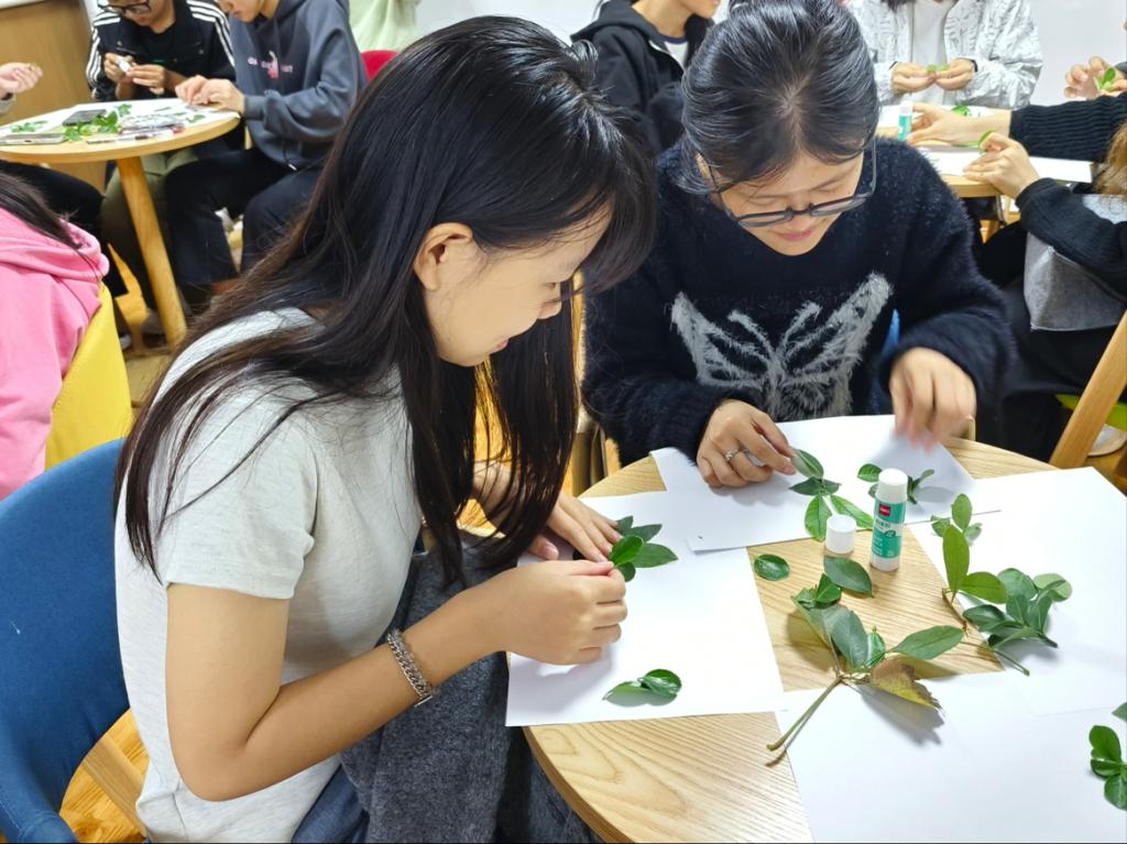 活动中,志愿者向同学们介绍了秋天常见的植物、不同树叶的形状,并讲解了树叶粘贴画的制作过程和注意事项。随后,志愿者们分发了树叶和工具,同学们利用收集的树叶进行二次创作,结合修剪、拼装、粘贴、添画等手法,描绘着自己眼中的秋日之景,创作出一幅幅充满趣味、栩栩如生的作品,让每一片树叶都充满着生命力。
