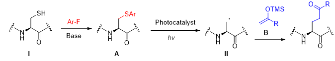非天然氨基酸(UAAs)是有机合成中常见的砌块,在蛋白质标记和药物发现等领域都有广泛的应用。由于其巨大的应用潜力,非天然氨基酸的合成长期以来一直是有机合成的重要课题之一,但是现存合成方法往往需要繁杂的合成步骤。同时,已知的含半胱氨酸的多肽修饰策略主要依赖于巯基的亲核性,通过构建C-S键来得到修饰产物。而基于C-C键构建的多肽直接修饰的策略仍然比较罕见。因此,通过简单的方法来合成非天然氨基酸和对多肽进行直接修饰具有重要意义。