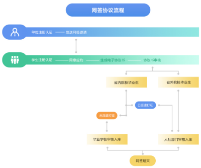 (1)毕业生:与省外与工作单位达成就业意向后,由毕业生登录信息网先提出省外就业申请,并持有效证件到学校就业指导中心领取纸质协议书同用人单位签约;