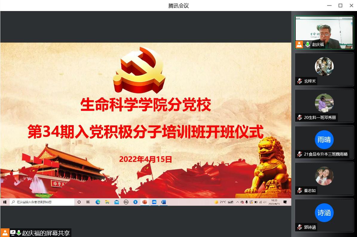 4月15日,kaiyun开云官方党委书记赵庆福通过腾讯会议主持召开了第34期入党积极分子培训班开班仪式。会上,赵书记对本次培训的指导思想、培训对象、培训目的、培训内容及考核方式进行了详细解读和具体阐述,并对学员们提出了两点要求,一是要珍惜此次培训机会,系统学习党的知识,了解党的政策、理论、方针、路线;二是按时上课、认真学习,为未来成为一名合格的共产党员打下坚实的基础。