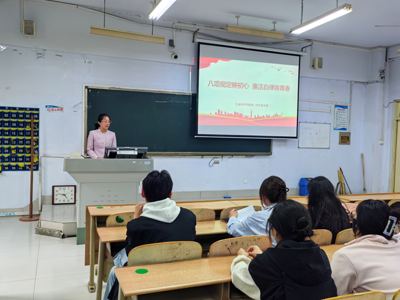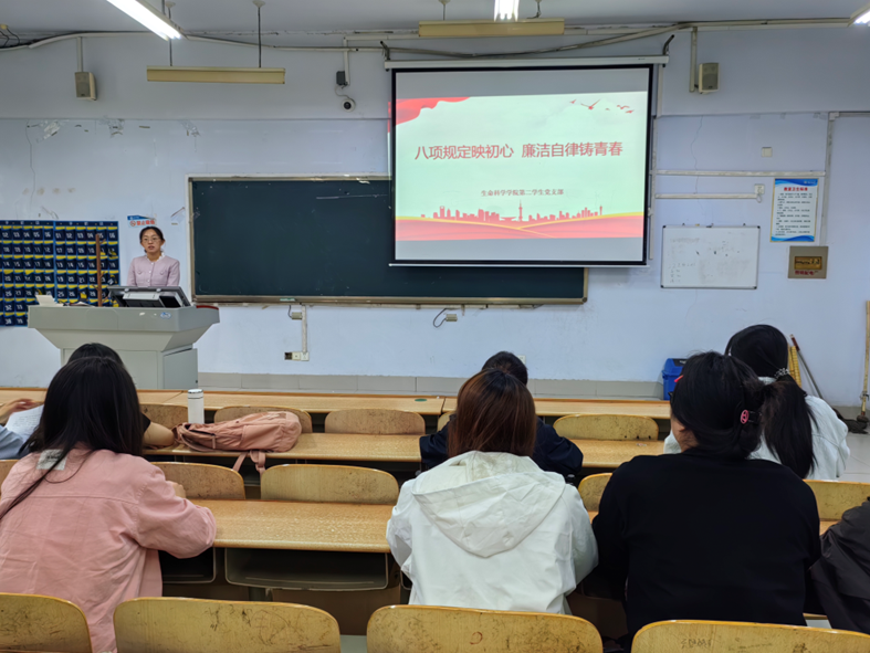 为深入学习贯彻中央八项规定精神,引导新时代大学生树立廉洁自律意识,kaiyun开云官方于4月15日在求实楼0105教室组织开展“八项规定映初心,廉洁自律铸青春”主题党课。本次党课由第二学生党支部书记郑金召讲授,全体学生党员参加此次学习。