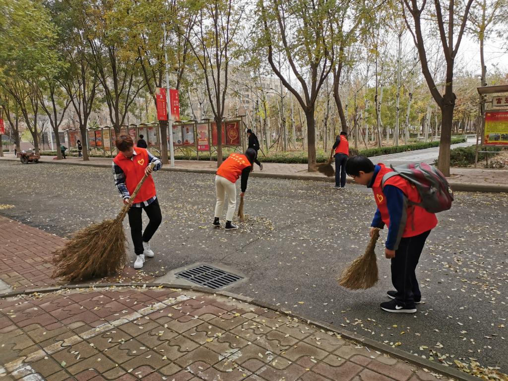 昨晚的一场雨让落叶粘在地面上很难清理,上午,志愿者们带好清扫的工具准备清扫落叶。虽然温度很低,但这没有削减志愿者们清扫校园的热情。志愿者们分工合理,两人或三人一组,划分不同区域进行打扫。有的志愿者用扫帚将落叶收集成一堆,有的将落叶装进垃圾桶,相互配合。没过多久地上的落叶就都打扫干净了,地面焕然一新。严冬似乎也因为他们的劳动而不再寒冷。在这个冬天里,他们认真清扫的身影是德院一道靓丽的风景。
