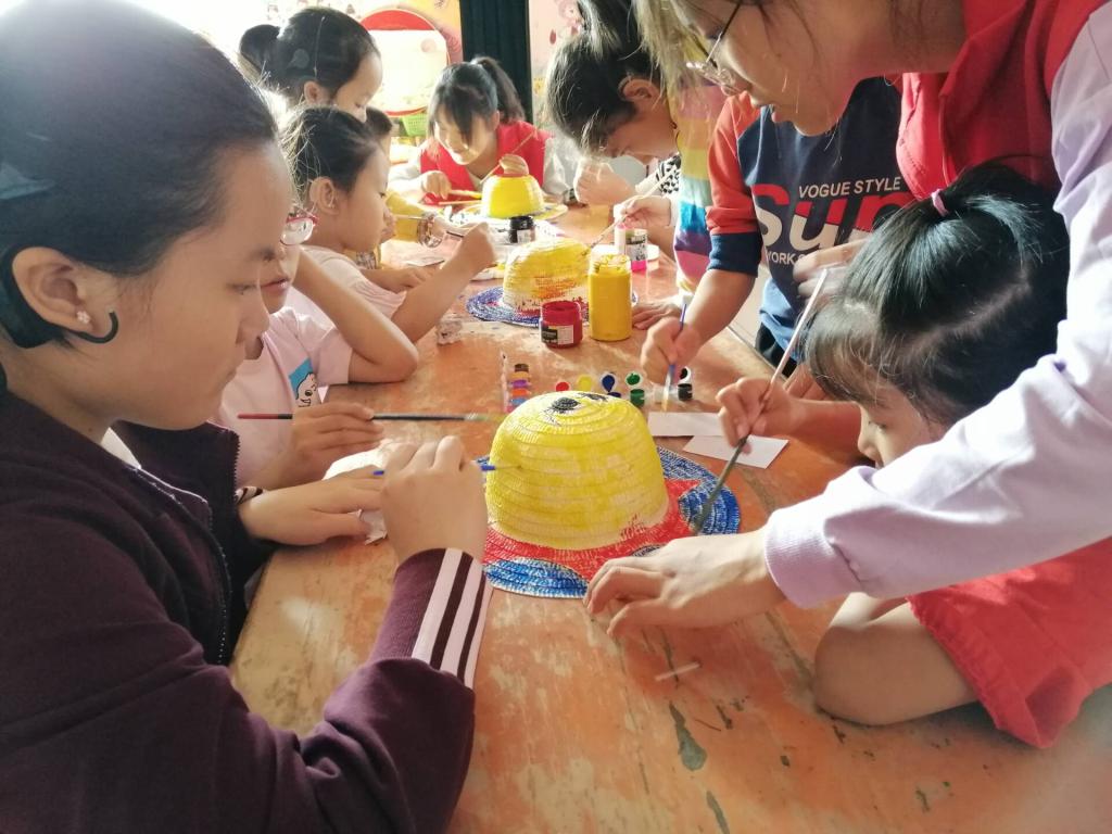 志愿者们给孩子们带来了各种各样的草帽和颜料画笔,参与创作的孩子们在志愿者的指引下,充分发挥他们的想象力和创造力,在帽子上画起了自己心中的图画。孩子们时而手拿画笔,仔细图画;时而停笔端详,认真思考。经过约一个半小时的现场创作,孩子们完成了自己的作品,一顶顶风格各异的草帽展现在大家面前。孩子们看着自己的作品,都露出了甜美的笑容。