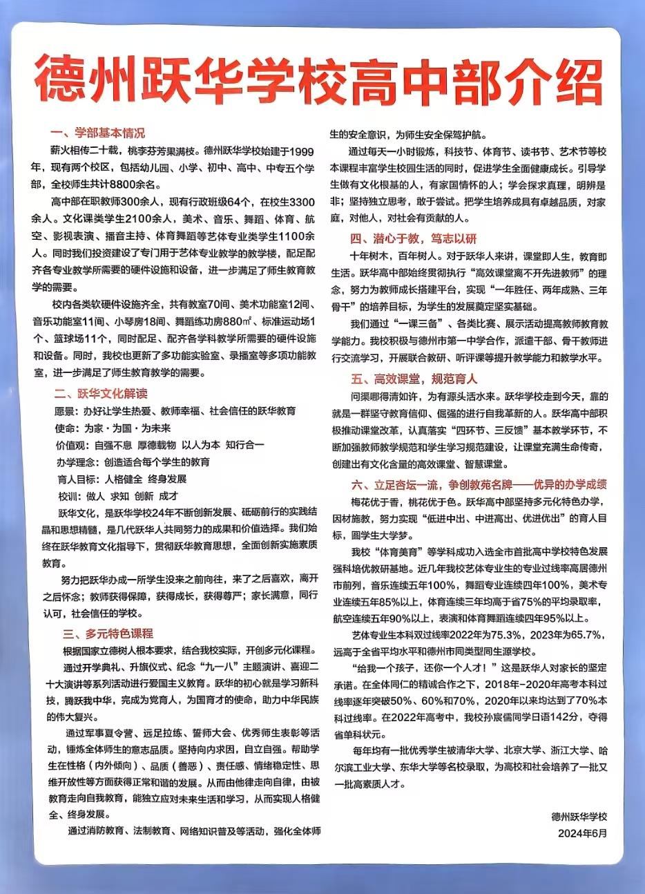 薪火相传二十载,桃李芬芳果满枝。德州跃华学校始建于1999年,现有两个校区,包括幼儿园、小学、初中、高中、中专五个学部,全校师生共计8800余名。