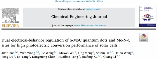 本网讯 近期,我校beat365正版唯一官方网站在能源器件方向取得新进展,相关研究成果以“Dual electrical-behavior regulation of α-MoC quantum dots and Mo-N-C sites for high photoelectric conversion performance of solar cells”为题发表在国际著名期刊《Chemical Engineering Journal》上。beat365正版唯一官方网站为第一完成单位,学院姚吉鑫博士为第一作者。《Chemical Engineering Journal》期刊影响因子指数16.744,涵盖了工程技术、化工全领域的基础和跨学科领域的应用研究,收录了领域内最前沿的优秀论文。