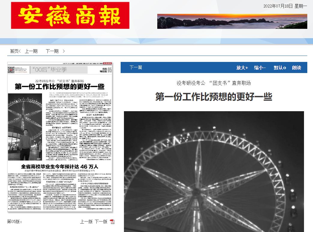 本网讯 近日,安徽商报以《没考研没考公 “团支书”直奔职场》为题,专题报道了我校电子信息与电气工程学院电子信息工程专业毕业生洪万里同学的求职故事。