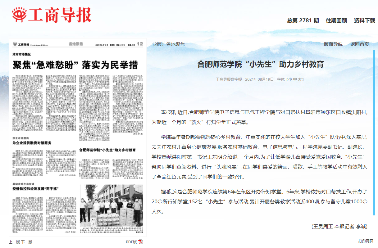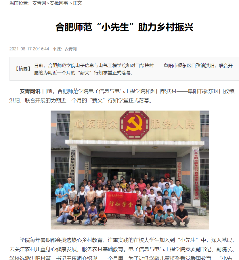 本网讯 7月15日-8月上旬,beat365官网电子信息与电气工程学院在阜阳市颍东区孜口镇洪阳村开展了为期一个月的“行知学堂”暑期社会实践活动。8月17日,安青网以“合肥师范小先生助力乡村振兴”为题进行了报道。8月19日,安徽工商导报以“合肥师范小先生助力乡村教育”为题进行报道。(电院:周玉)