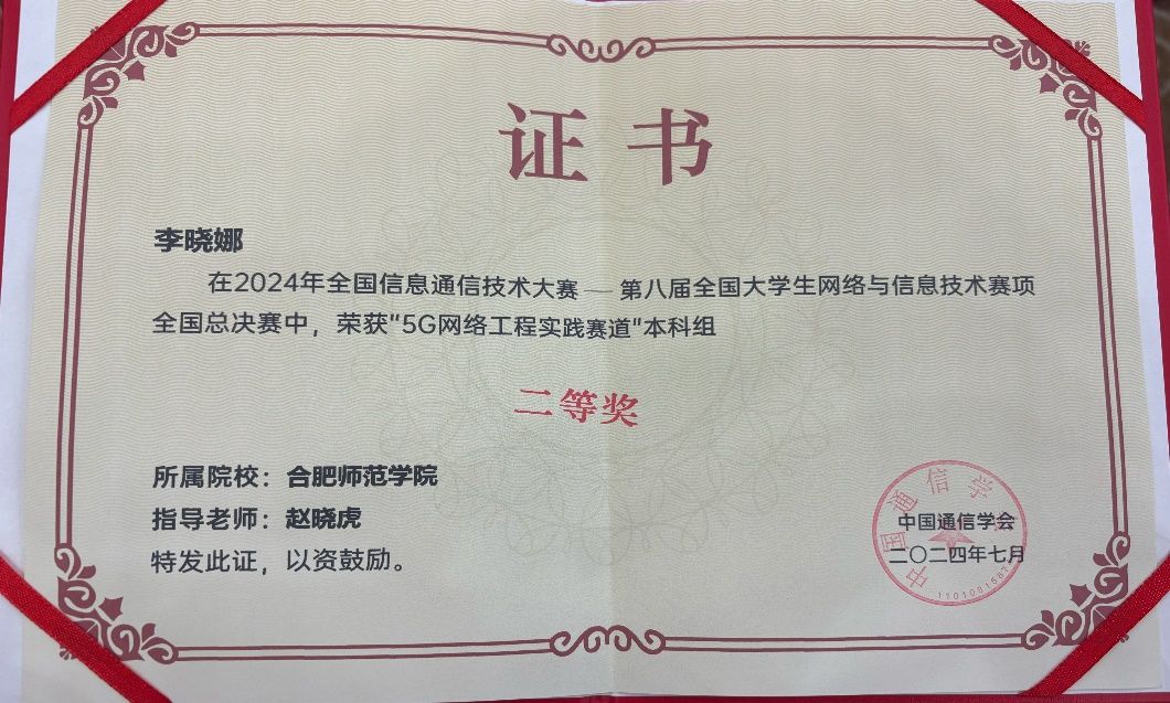 在教务处支持下,beat365正版唯一官方网站安排竞赛指导教师,对参赛队伍进行赛事全过程培训指导。最终,由赵晓虎老师指导的2023级通信工程2班李晓娜同学在以安徽、江苏、浙江、上海等7个省、直辖市的100余所高校组成的区域赛中荣获5G网络工程实践赛道(本科组)一等奖晋级全国总决赛,并在全国总决赛中经过激烈角逐和严格评审,荣获全国总决赛二等奖。