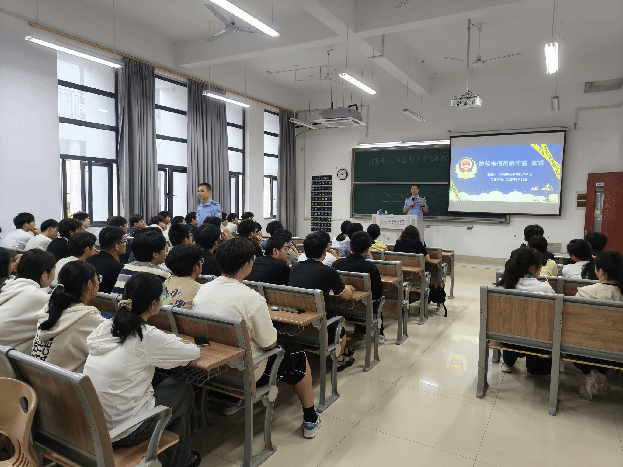 为进一步增强在校大学生防范电信网络诈骗的意识和能力,筑牢校园安全防线。2025年9月26日上午9时,一场以“防范电信网络诈骗”为主题的反诈安全教育主题宣讲在beat365正版唯一官方网站滨湖校区博学楼A106教室召开。本次活动由学校保卫处牵头,beat365正版唯一官方网站组织,特邀巢湖市公安局反诈中心警官担任主讲,为同学们带来了一堂生动的反诈知识普及课。