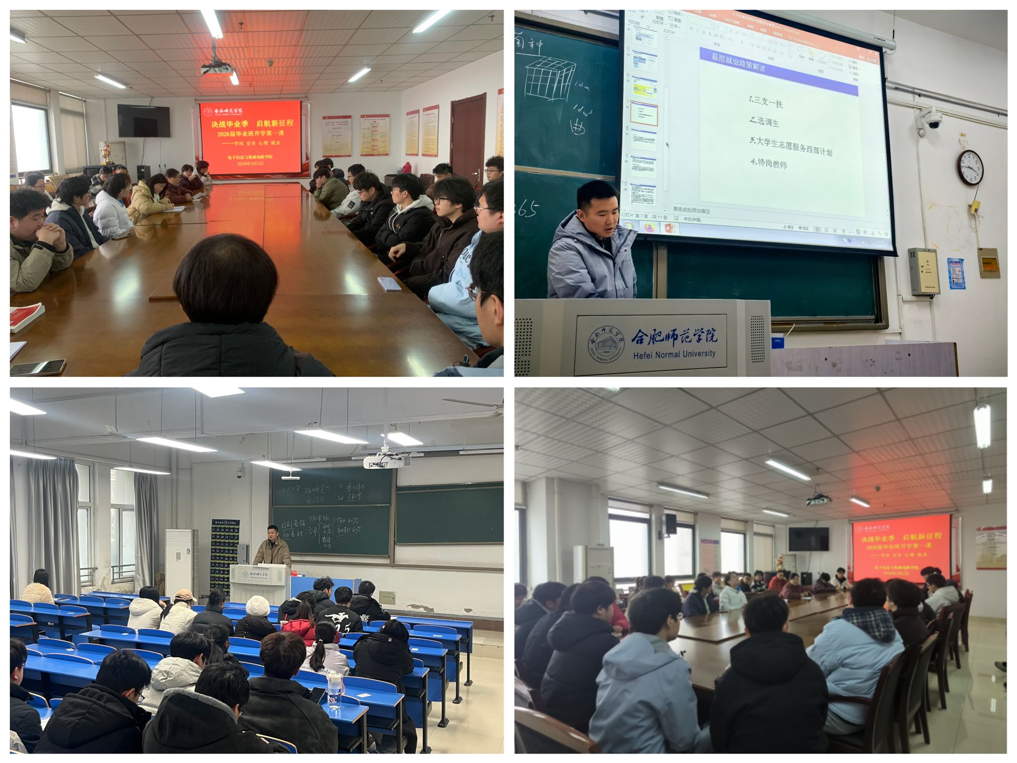 毕业班班会围绕“端正学风、严守安全、调适心态、精准就业”展开。毕业班辅导员详细解读春季就业招聘政策、考研复试流程与调剂规则,为尚未落实单位的学生提供岗位信息与求职指导,引领学生树立“先就业、后择业”的就业观。重点关注学生毕业焦虑与求职挫折,开展心理疏导,鼓励学生以积极心态面对挑战。