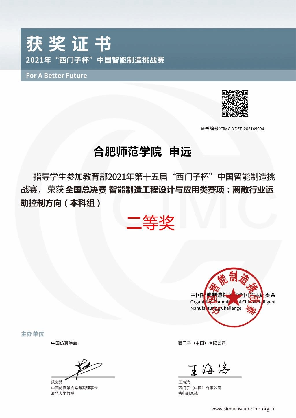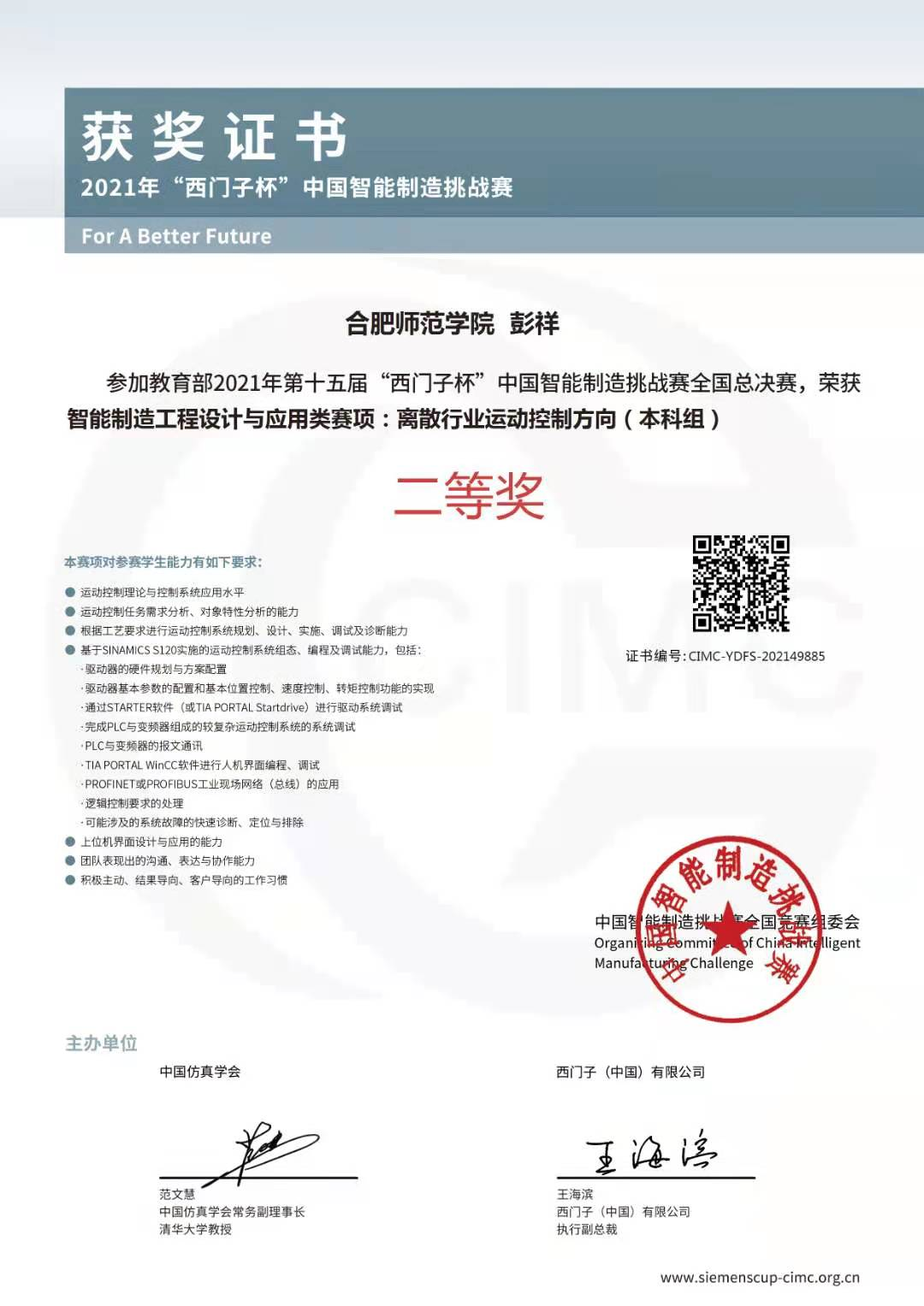 本网讯 近日,2021年第15届“西门子杯”中国智能制造挑战赛全国总决赛结果正式揭晓。我校电子信息与电气工程学院学子彭祥、孙亮在申远、高敏两位老师指导下以安徽省赛一等奖的名次晋级全国总决赛,在全国总决赛中获得“离散行业运动控制方向”项目二等奖,这也是该赛事自举办以来学校历史上首次获得国赛奖项。