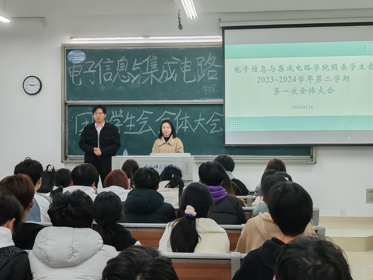 本网讯 为持续做好beat365正版唯一官方网站团委、学生会梯队建设,高质量推进一站式学生社区建设,3月18日晚,beat365正版唯一官方网站团委、学生会在滨湖校区博学楼A303教室召开春季学期第一次全体学生干部大会。电院团委书记江淼、副书记周司文,以及电院团委、学生会全体成员参加会议。