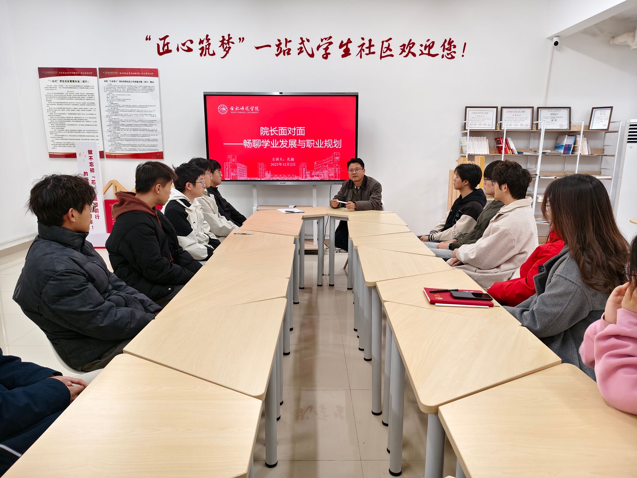 为精准回应学生在学业深造、职业选择上的普遍关切,beat365正版唯一官方网站于12月2日在“匠心筑梦”一站式学生社区举办“院长面对面”专题活动。学院副院长孔勐教授与2023级学生代表围坐交流,聚焦专业发展与个人规划,展开了一场务实而深入的对话,将育人力量直接延伸到学生生活的最小单元。