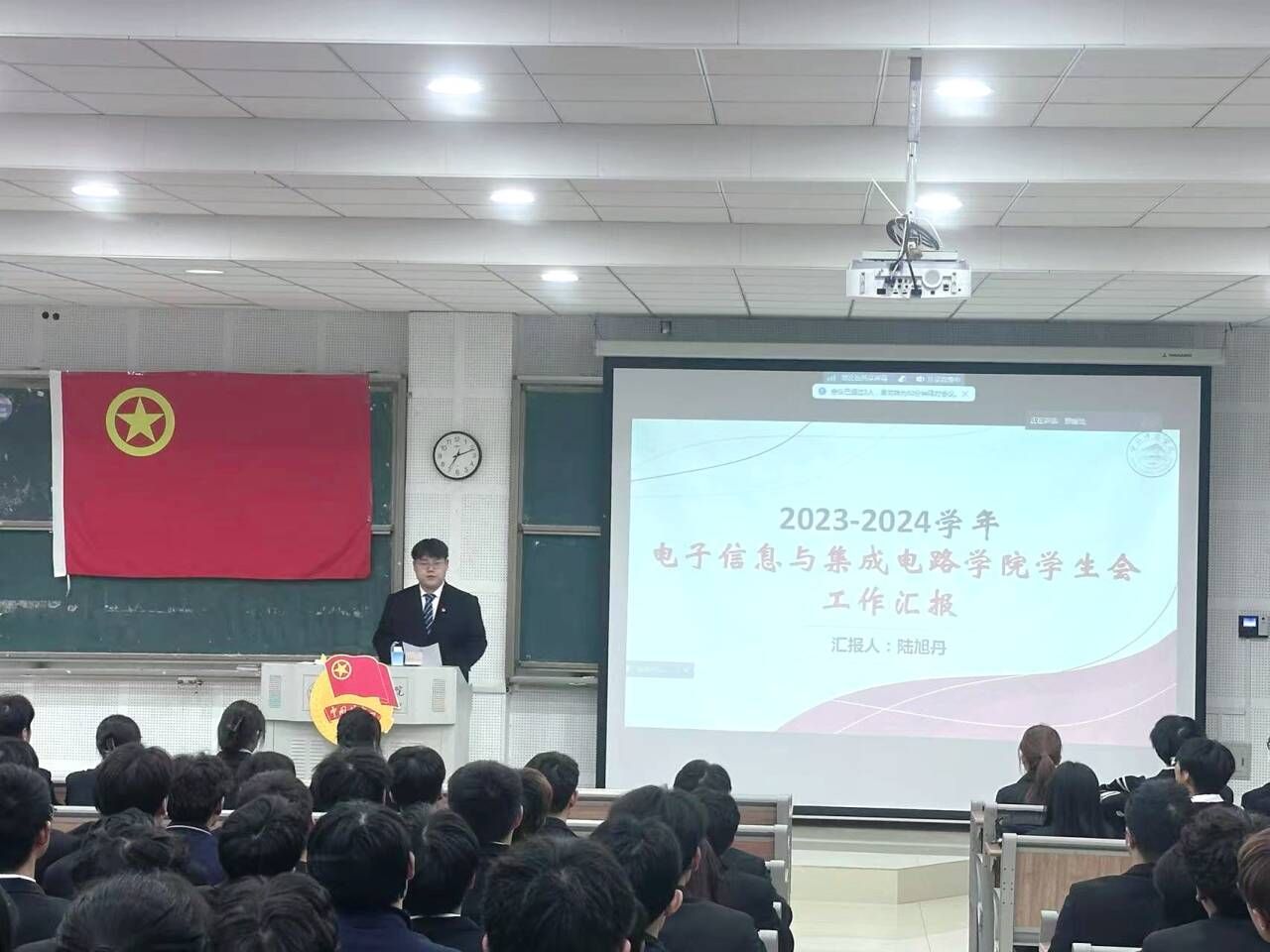 随后,电院团委学生副书记陆旭丹同学受电院第六届学生会主席团委托,作2023-2024学年电院学生会工作报告,汇报了过去一年学生会的工作和取得的成绩,以及今后的努力方向。