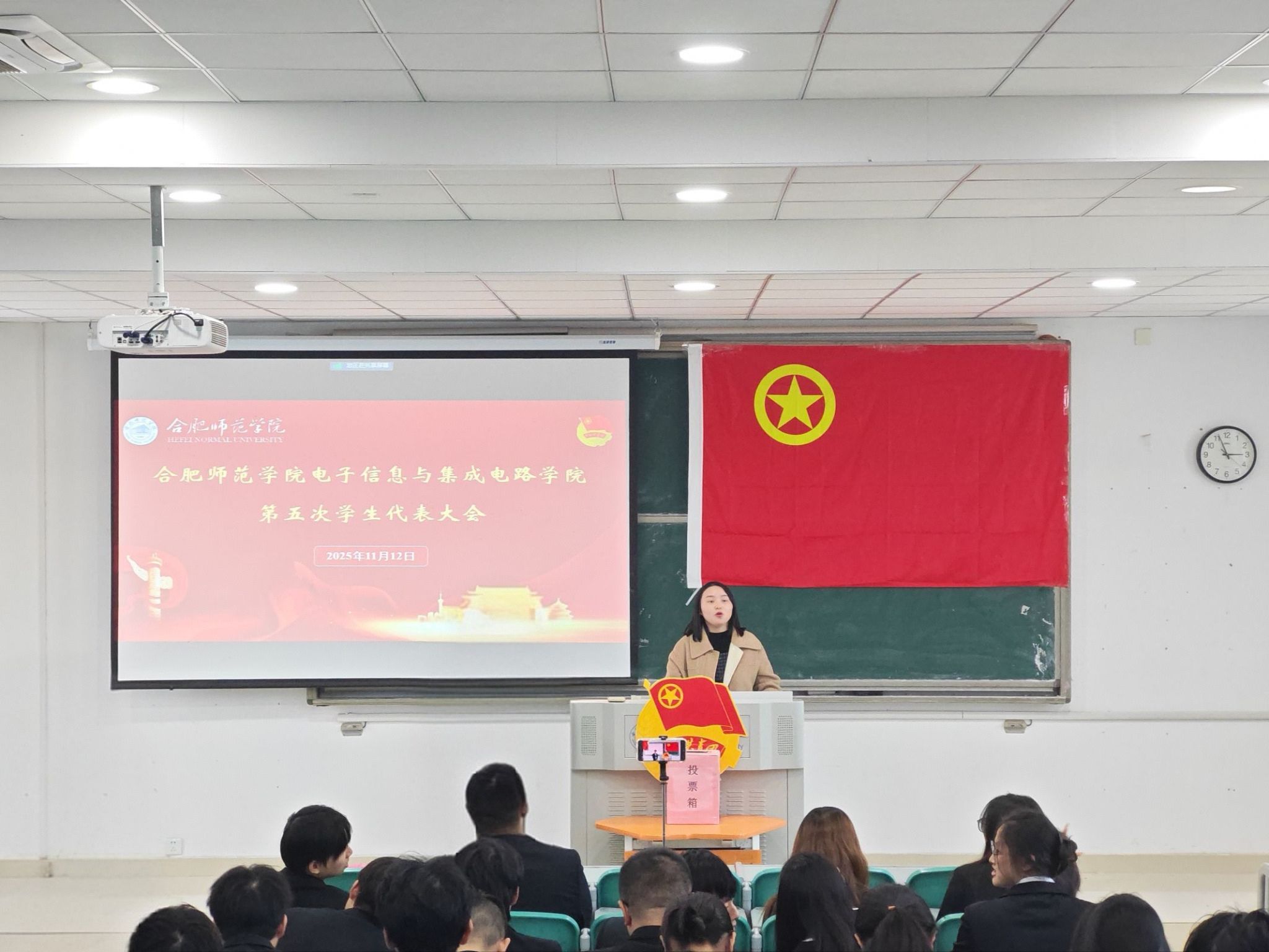 本网讯 11月12日下午,beat365正版唯一官方网站第五次学生代表大会顺利举行。本次大会采取了两校区同步、实时网络直播方式,主会场设在滨湖校区博学楼A203,分会场设在锦绣校区逸夫楼A202。beat365正版唯一官方网站党委副书记周贵勤、分团委书记江淼以及学院各年级学生代表共计120余人参加大会。