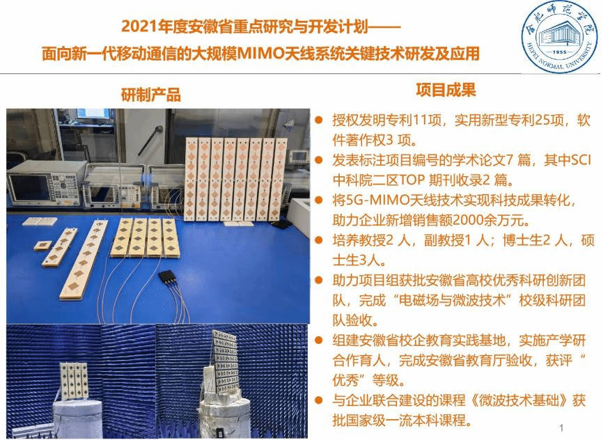 该项目通过优化MIMO天线系统关键技术,开发了适用于新一代移动通信频段的双极化单元微带天线、1*4阵列天线、1*8阵列天线、4*4阵列MIMO天线、8*8阵列MIMO天线等系列产品,实现了MIMO天线系统双极化、高增益、可重构的性能,降低了MIMO天线系统硬件复杂度。项目授权发明专利11项,实用新型专利25项,软件著作权3项;发表标注项目编号的学术论文7篇,其中SCI中国科学院二区TOP期刊收录2篇。系列产品经安徽省电子产品监督检测所检测,均符合合同技术指标,已在省内外电子、通信企业中实现推广应用,取得了良好的经济效益和社会效益。该项目的顺利结题验收,标志着beat365官网高水平科研项目结题质量稳步提升。科研处将继续加强科研项目过程服务,以项目为抓手,助推高水平科研成果产出,推进beat365官网科学研究高质量发展。
