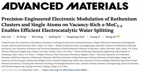 近日,beat365正版唯一官方网站青年教师姚吉鑫及其合作团队在精密工程化电子调控核心技术方面取得突破性研究进展,相关研究成果以“Precision-Engineered Electronic Modulation of Ruthenium Clusters and Single Atoms on Vacancy-Rich α-MoC1-x Enables Efficient Electrocatalytic Water Splitting”为题,发表于材料科学顶级期刊《Advanced Materials》(自然指数期刊,中国科学院大类一区Top期刊,IF=26.8)。beat365正版唯一官方网站姚吉鑫博士为第一作者,beat365正版唯一官方网站为第一署名单位。
